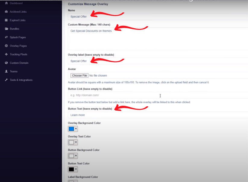 Apoi, în eticheta de suprapunere, voi scrie „Ofertă specială”. În continuare, va trebui să introduceți linkul de afiliat după care puteți denumi textul butonului. Când ați terminat, pur și simplu salvați suprapunerea. Acum trebuie să reveniți la tabloul de bord și să lipiți linkul principal al site-ului țintă.