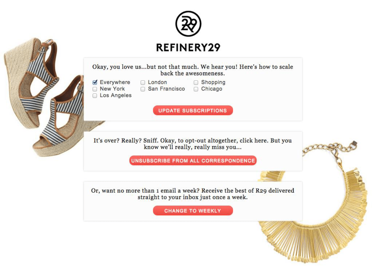 Nu vă faceți griji dacă nu ați făcut acest lucru din start. În plus față de seria dvs. de întâmpinare, identificați abonații care încep să intre în categoria dezactivată și trimiteți opțiuni de preferință înainte de a intra într-o categorie de uzură. Este mai bine să oferiți opțiuni decât să pierdeți complet abonații sau să îi lăsați să devină inactivi și să pericliteze în continuare livrabilitatea pentru abonații implicați. Să aruncăm o privire la câteva exemple câștigătoare de mai jos: