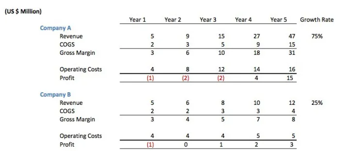 Deci, pentru început, când doriți să evaluați companii, doriți să evaluați „creșterea”. Privind doar câștigurile din două companii nu vă va spune imaginea diferitelor perspective.