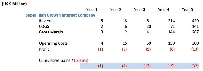Dar să luăm în considerare un scenariu și mai agresiv. Să o numim compania de internet cu „creștere super mare”. Știi, genul pe care comentatorii neștiutori s-ar grăbi să-l condamne ca fiind risipitori, pentru că nu sunt profitabili.