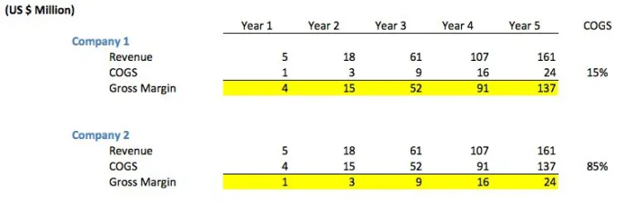 Dar nu este la fel de simplu ca să privim veniturile în dolari. De exemplu, uitați-vă la graficul următor. Veți observa că, deși ambele companii au același venit în fiecare an, compania 1 are marje brute MULT mai mari decât compania 2, deoarece costul vânzărilor (COGS) este mult mai mic.