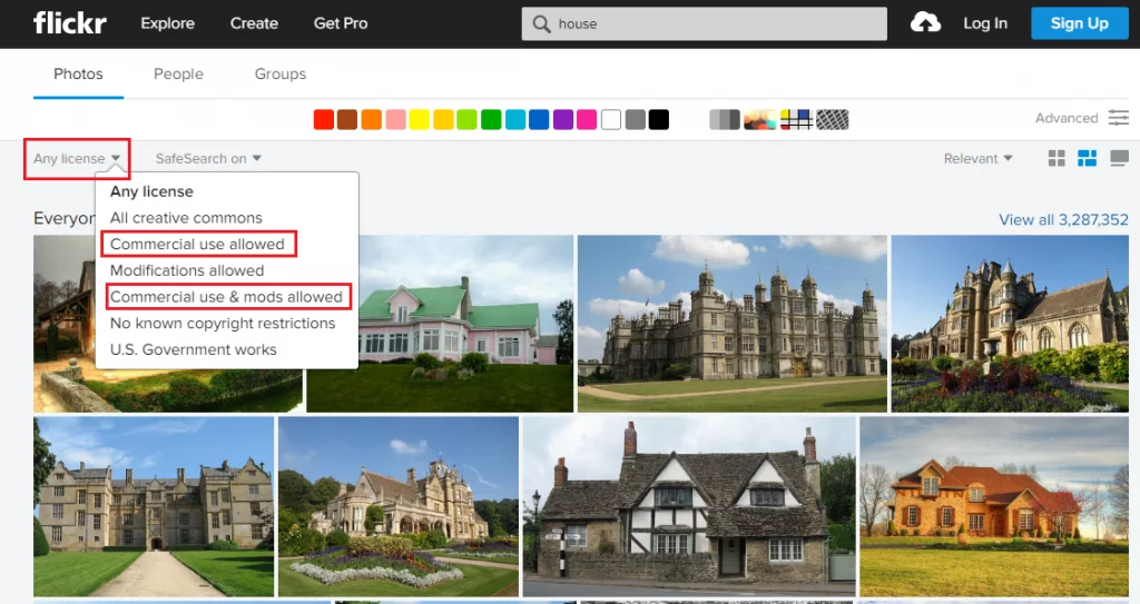 Similar cu Google, vă puteți filtra căutarea după tipul de licență. Cele pe care le căutați sunt „utilizare comercială permisă” și „utilizare comercială și moduri permise”.