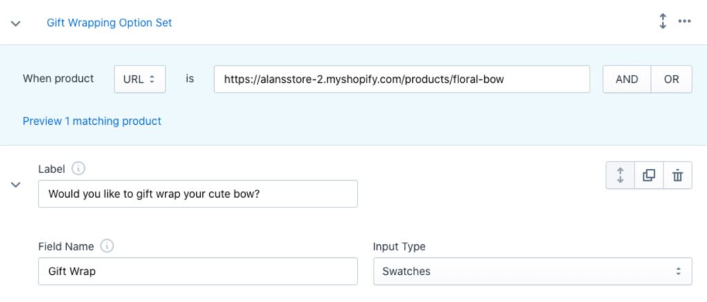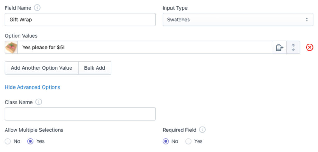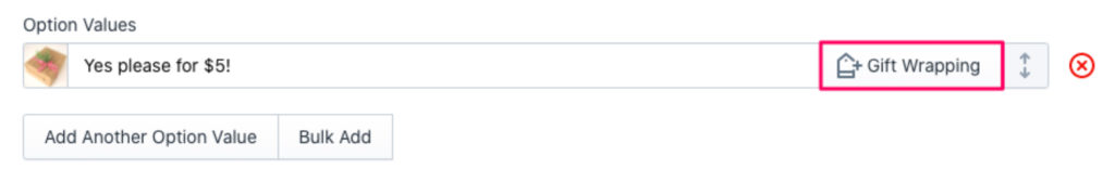 Cu Opțiuni infinite, puteți oferi o imagine a produsului final cu selecția utilizând un tip de introducere a eșantionului atunci când creați selecția de ambalaj cadou. Pur și simplu adăugați fotografia pe care doriți să o prezentați făcând clic pe pictograma imagine de lângă valoarea opțiunii dvs. pentru selecția de împachetare cadou.