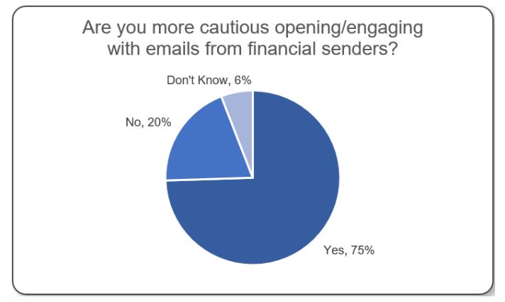 Dar nu mă crede pe cuvânt. În ediția Validity FS a seriei de webinar State of Email Live, am cerut publicului nostru părerile lor despre această chestiune: un răsunător 75% au spus că sunt mai precauți atunci când deschid și/sau interacționează cu e-mailurile care vin de la expeditori financiari!