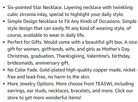 Acest marcator de caracteristici este plin de cuvinte cheie, dar nu citește bine. O modalitate mai bună de abordare a includerii cuvintelor cheie ar fi să le introduceți organic în text, onorând algoritmul și clienții Amazon.