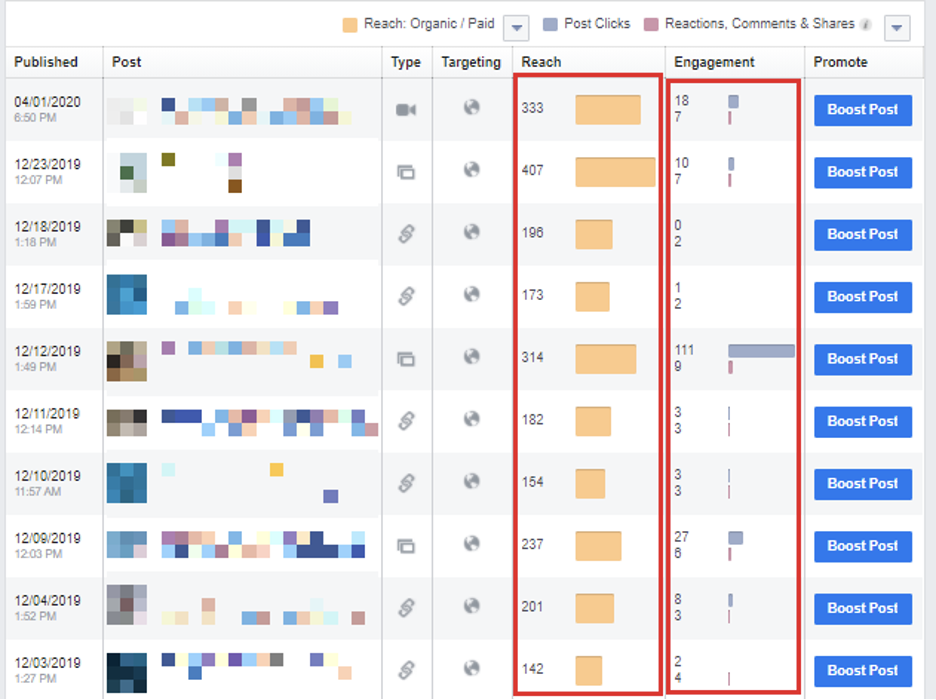 Acest truc va funcționa pentru alte platforme de social media. De exemplu, dacă accesați Facebook Insights și verificați fila Postări , veți vedea o defalcare post-cu-post și de implicare: