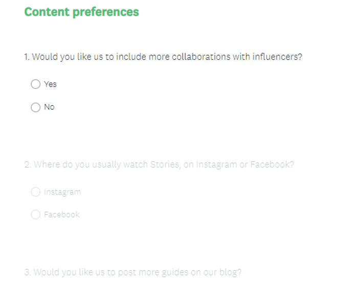De exemplu, iată un exemplu de sondaj privind preferințele de conținut realizat cu SurveyMonkey: