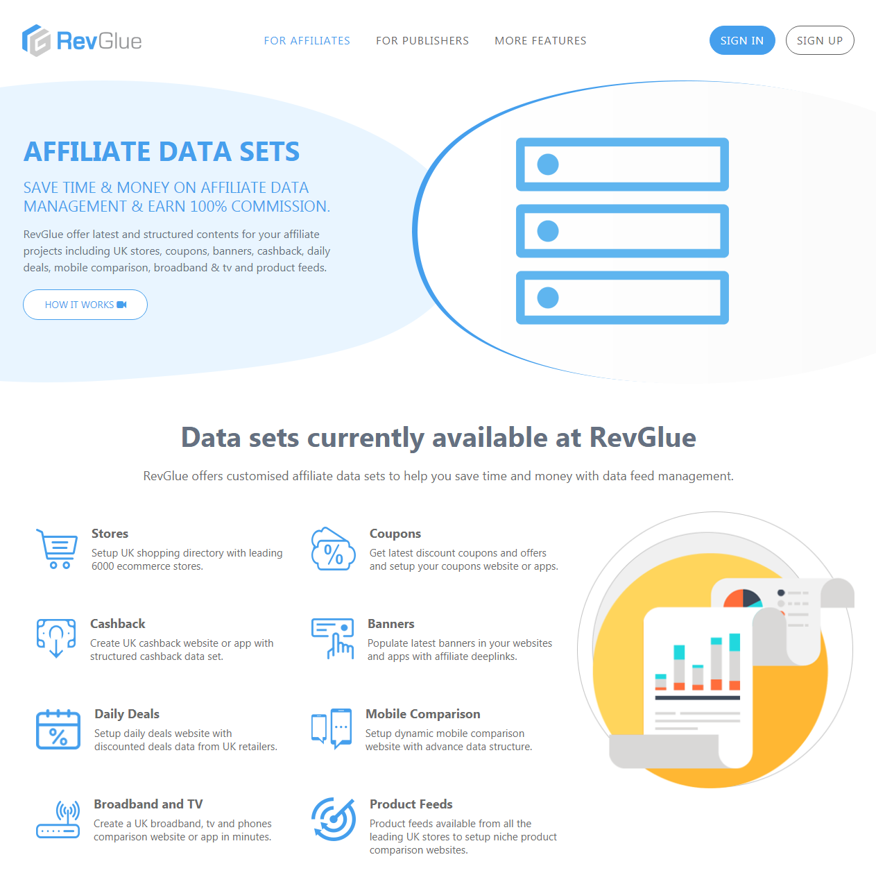 Аффилированные лица с техническими навыками или команды, которые могут создавать свои собственные партнерские веб-сайты, но не имеют ресурсов для управления контентом, могут подписаться на услуги данных RevGlue по легкой модели подписки в размере 60 фунтов стерлингов в месяц или 600 фунтов стерлингов в год. Филиалы могут предоставлять свои собственные идентификаторы аффилированных лиц или использовать SkimLinks в качестве предпочтительной подсети, чтобы их можно было заменить в API данных. Это позволит партнерам зарабатывать 100% комиссионных от партнерских сетей.
