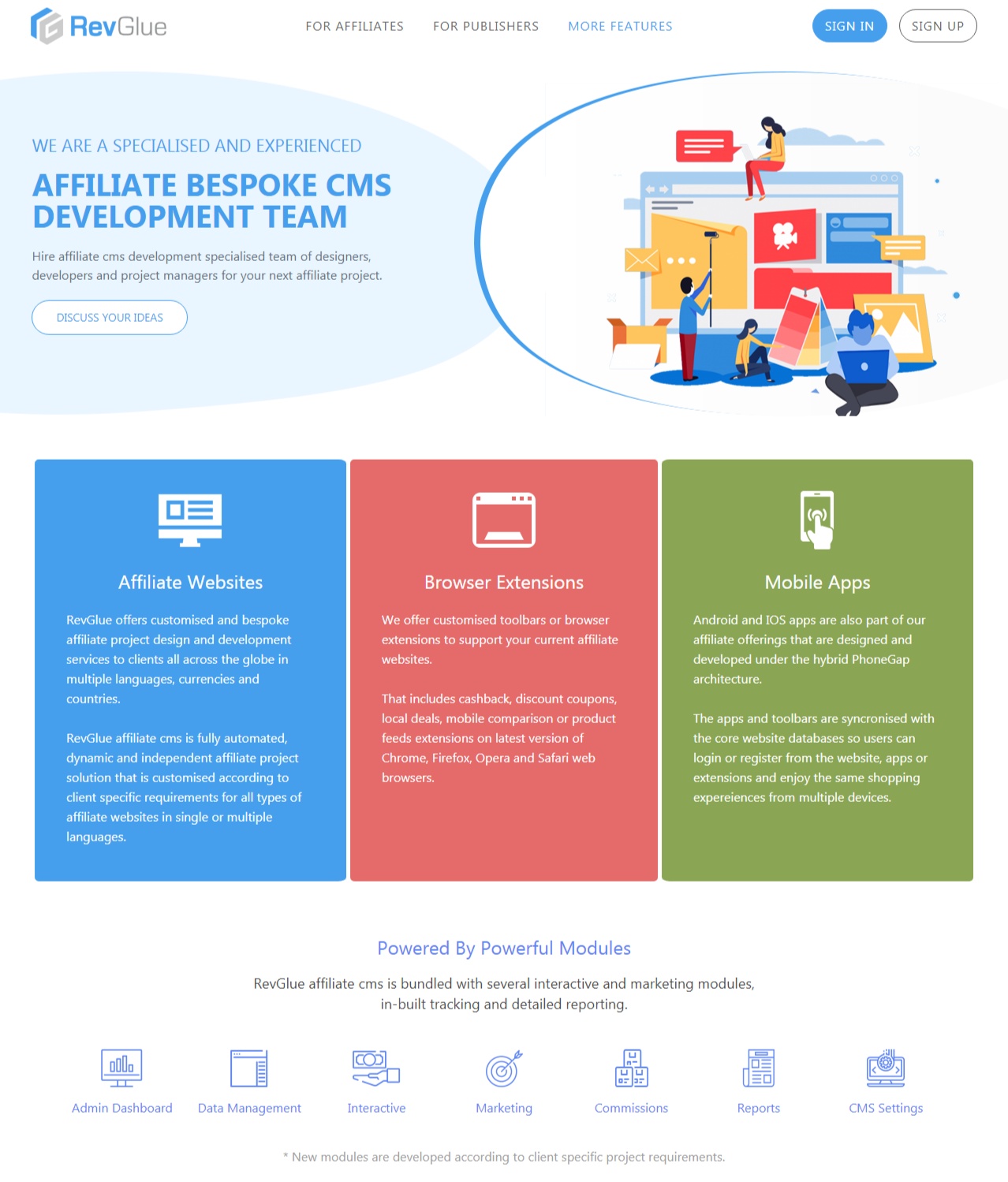 Цель этого модуля - позволить аффилированным лицам использовать RevGlue в качестве своего технологического партнера, потому что этот модуль предоставляет партнерские веб-сайты, включая дизайн, разработку, структурированное содержимое, хостинг, управление веб-сайтами и обучение по простым контрактам на шесть или один год, которые работают на сумму менее 100 фунтов стерлингов. в месяц. В этих пакетах партнеры могут настроить купоны, ежедневную агрегацию сделок, кэшбэк, нишу товарных фидов, широкополосный доступ или мобильные сайты сравнения.