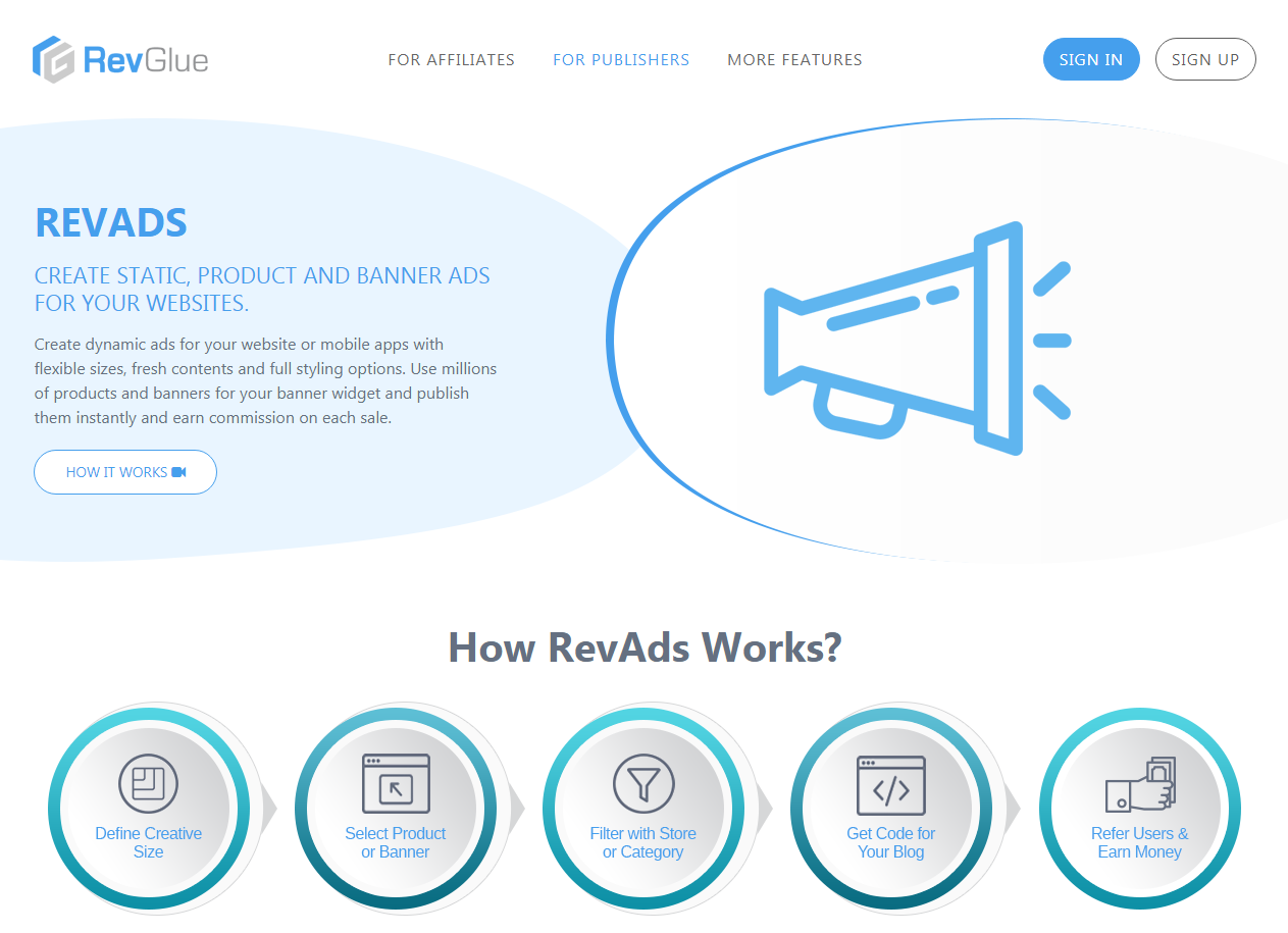 Партнеры с веб-сайтами, мобильными приложениями, расширениями для браузеров или каналами социальных сетей могут легко создавать динамические объявления с помощью модуля RevAds. Этот инструмент позволяет аффилированным лицам создавать рекламу на основе баннеров магазинов или товаров из нескольких категорий или магазинов. Инструмент полностью динамический, что позволяет партнерам мгновенно изменять стиль и параметры рекламы. Затем партнеры могут публиковать рекламу с помощью простого фрагмента кода на своих веб-сайтах и получать комиссию с каждой продажи, которую они направляют в магазины электронной торговли через эти объявления. RevAds можно использовать бесплатно и предлагает 80% комиссионных партнерам с каждой продажи.