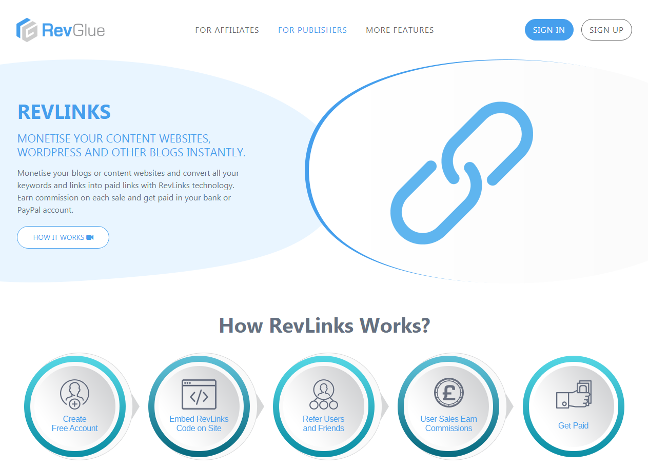 RevGlue представляет собой динамичный и простой в монетизации инструмент для блоггеров и авторов контента. Инструмент RevLinks автоматически читает все сообщения в блогах и преобразует соответствующие ключевые слова и ссылки в платные ссылки, чтобы блоггеры могли получать комиссию за каждую продажу, сделанную в магазинах электронной торговли из своих сообщений в блогах.