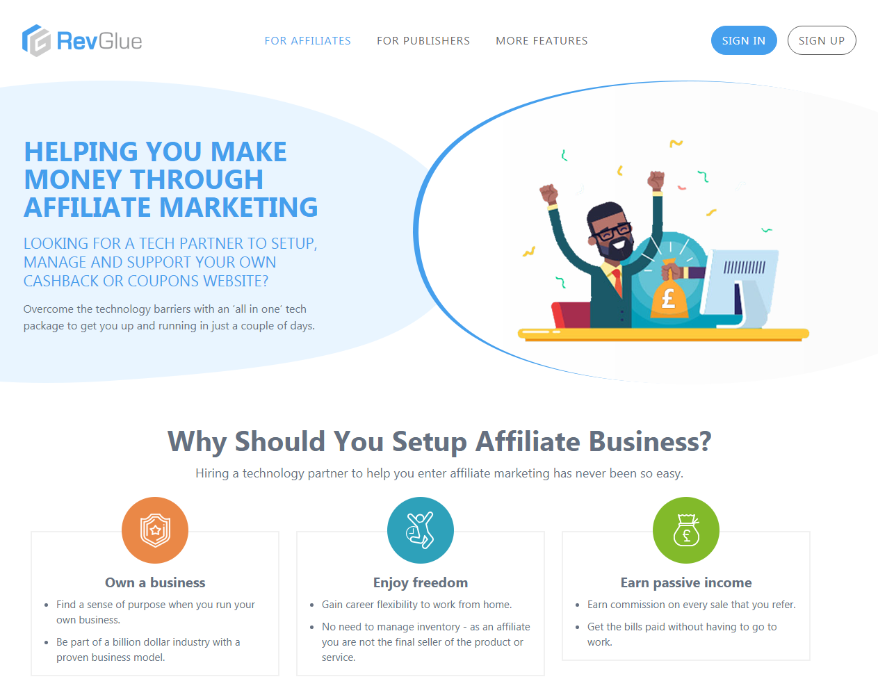 Партнерский маркетинг предлагает беспроигрышную ситуацию для всех участников. Когда партнеры имеют профессиональную техническую поддержку и поддержку в области управления контентом, то есть RevGlue, это может привести к увеличению продаж для магазинов электронной коммерции, увеличению комиссионных для филиалов, сетей и доказывает лучшую приверженность менеджеров филиалов своим аффилированным лицам.