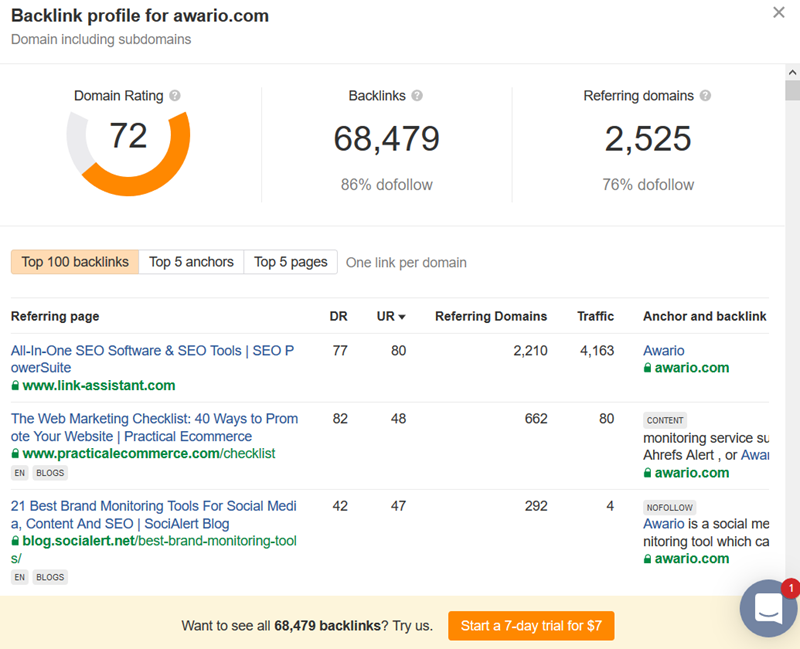 Вы можете бесплатно опробовать некоторые функции Ahrefs на их собственном веб-сайте. Подобно другим инструментам проверки ссылок в списке, бесплатная версия ограничена, но с немного другой точки зрения: вы можете видеть только 100 лучших обратных ссылок на свой домен.