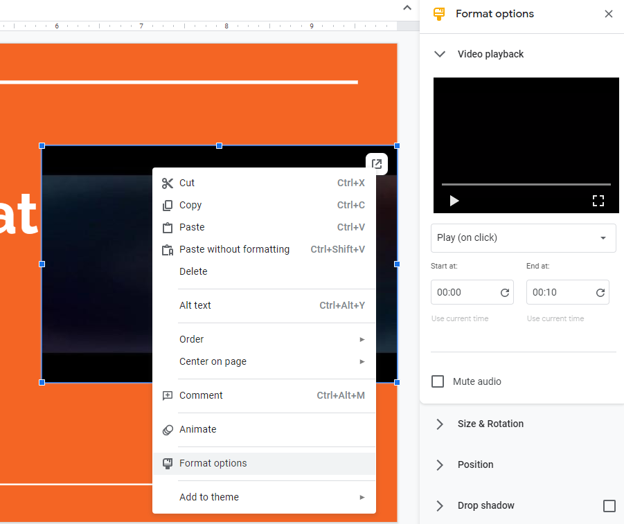 А с Google Slides вы можете найти больше опций, щелкнув правой кнопкой мыши добавленное видео. Вы должны увидеть меню «Параметры формата », которое должно запускать дополнительные настройки на боковой панели для управления поведением автовоспроизведения, размером, положением и т. Д.