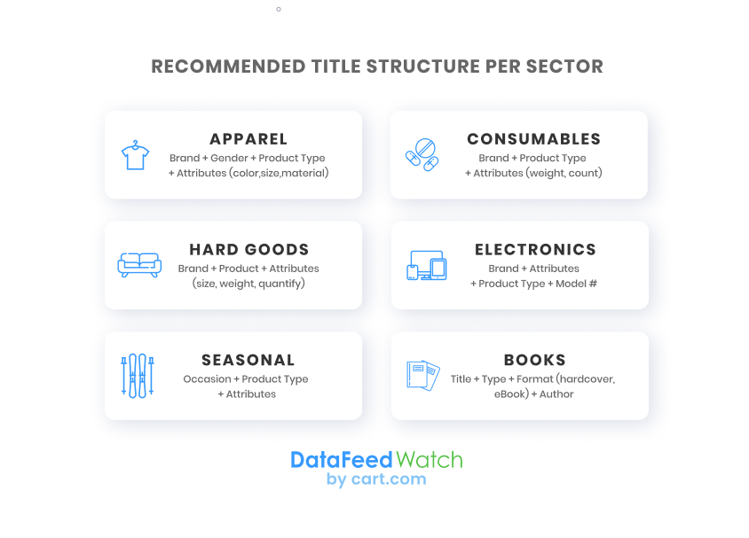 Порядок ключевых слов в заголовке продуктовых объявлений Google также имеет значение. В зависимости от отрасли вы можете воспользоваться рекомендуемыми структурами титулов, созданными на основе многолетнего опыта работы в конкретных секторах.