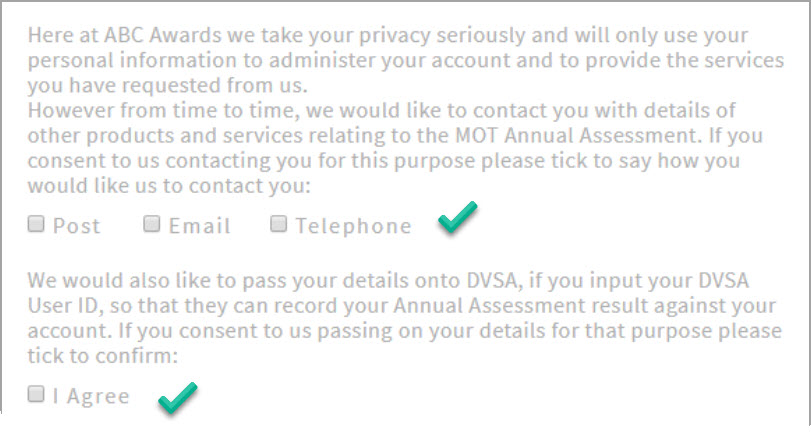 В этом примере ABC Awards запрашивают конкретное разрешение для каждого типа обработки (почта, электронная почта, телефон), а также запрашивают разрешение на передачу данных третьим лицам.