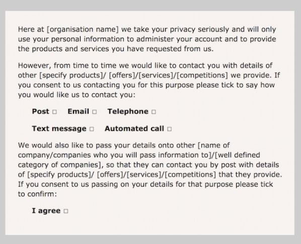Формы, которые приглашают пользователей подписаться на информационные бюллетени или указывают контактные предпочтения, должны по умолчанию иметь значение «нет» или быть пустыми. Вам нужно будет проверить свои формы, чтобы убедиться, что это так.