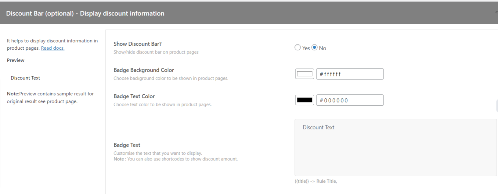 Следующий раздел — это раздел «Панель скидок», где вы можете отображать скидки на странице продукта с помощью настраиваемой панели скидок.