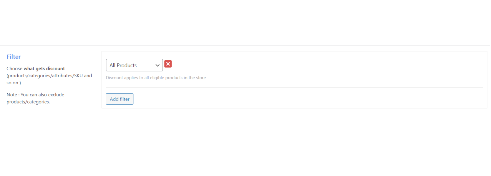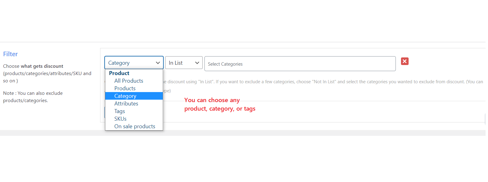 После того, как вы выбрали настройку корзины, вам нужно отфильтровать товары, на которые вы не хотите давать скидки. Поскольку фиксированные скидки на корзину применяются на уровне корзины, вы можете добавить или исключить предоставление скидок на определенные продукты.