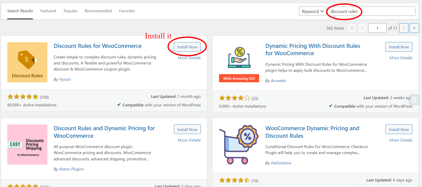 Найдите «Правила скидок для плагина WooCommerce» в поиске плагина WordPress и установите его.