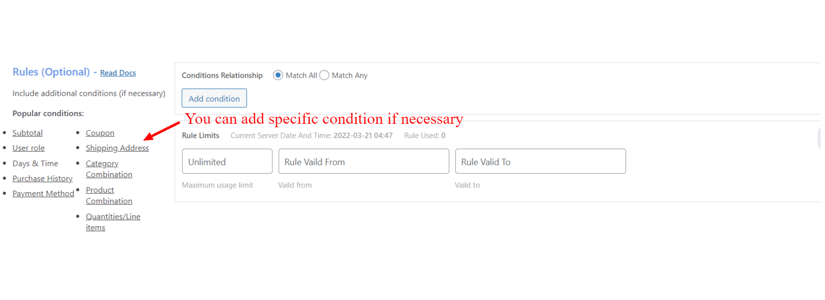 После того, как вы разместили промежуточные условия для своей корзины, вы можете нажать «Добавить условие», чтобы добавить новое условие. Вы также можете указать время скидки, которую хотите предложить в своем магазине.