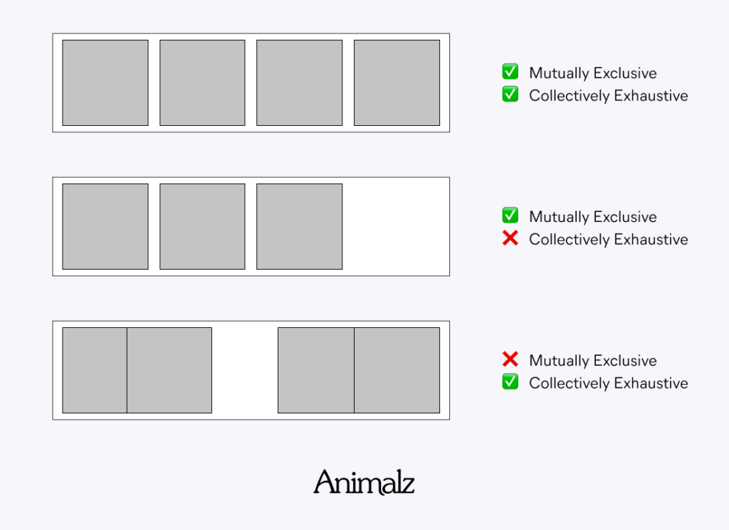 Ваши данные должны охватывать все пространство, которое они намеревались определить, и ни один из составляющих элементов не должен перекрываться. Если это так, набор данных — MECE.