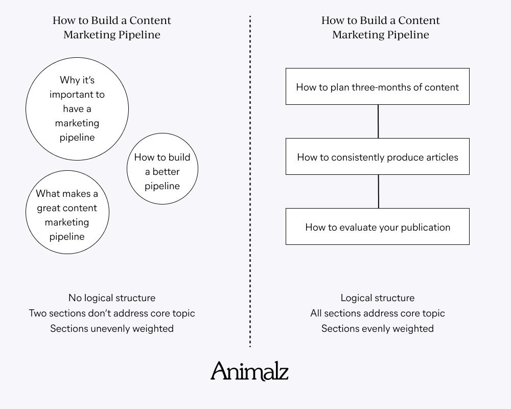 Вы можете видеть, как собственные исследования и рассуждения автора продиктовали структуру статьи: они открыли Google и спросили: «Ну, а зачем мне в первую очередь конвейер контента?» потом об этом писал. На первый взгляд, эта структура кажется разумной, но она совершенно не соответствует требованиям MECE.