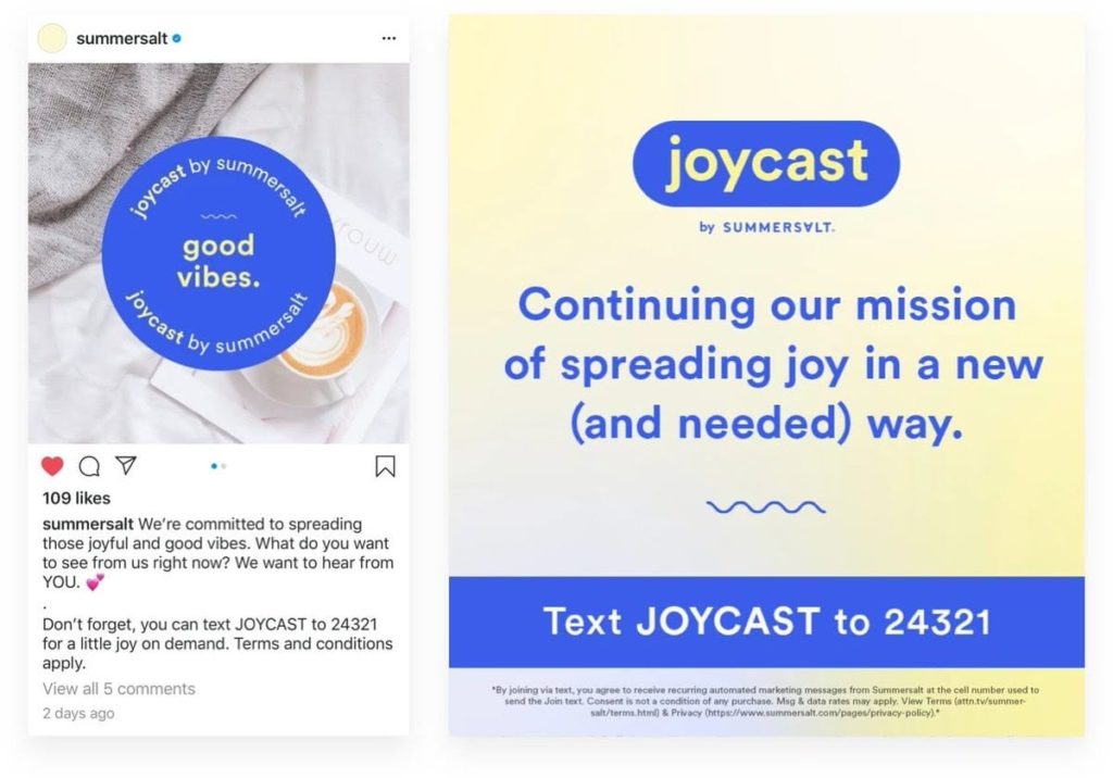 Все, что нужно было сделать людям, — это отправить слово «Joycast» на номер телефона, чтобы получать различные типы контента, такие как вдохновляющие мемы и действия, которые можно выполнять во время карантина.