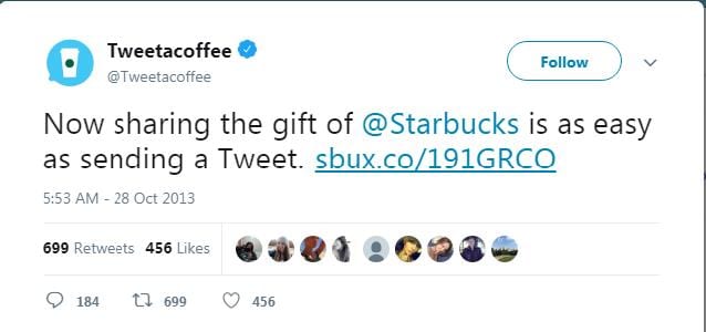Starbucks быстро заметила эту психологическую черту людей и начала кампанию по привлечению новых потенциальных клиентов. Это побуждало людей делиться хэштегом «#Tweetacoffee» с одним из своих друзей. Взамен компания предложила другу бесплатную чашку кофе. Кампания нашла отклик у своей аудитории и помогла компании увеличить продажи на 180 000 долларов.
