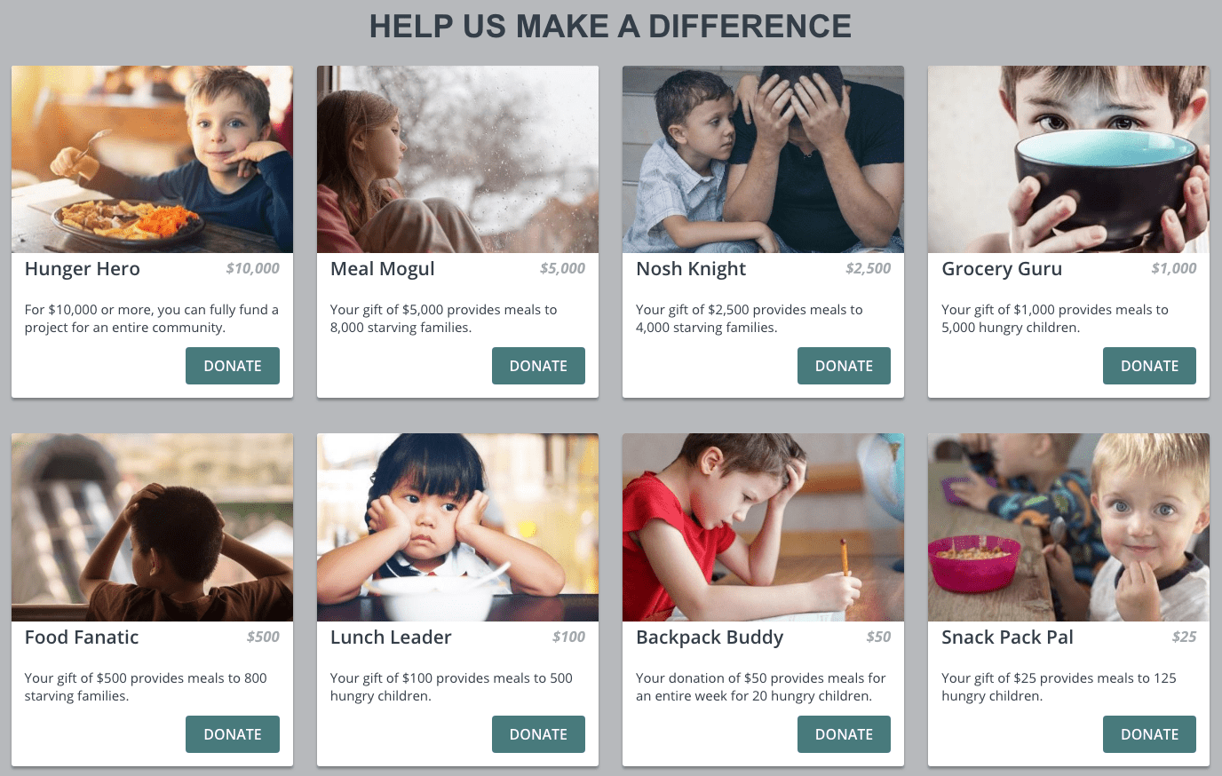 Кроме того, в каждом импакт-блоке есть четкое описание того, сколько именно обедов покроет это пожертвование для студентов. Кроме того, обратите внимание, что они начинаются с самого высокого пожертвования слева и уменьшаются по мере продвижения вниз по блокам. Это может помочь побудить людей жертвовать большие суммы, поскольку они реагируют на эмоциональный призыв, который вы им предлагаете.