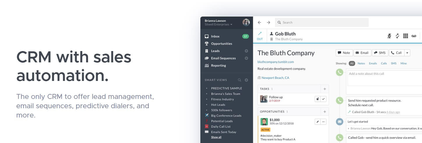 Это мощная CRM-система, которая позволяет синхронизировать работу вашего отдела продаж, менеджеров по работе с клиентами и службы поддержки. Вместо отправки электронных писем и использования календаря инструмент позволяет вам просто создать «возможность», которая появляется на панели управления и отображает ваши задачи и взаимодействия с клиентами (электронные письма, SMS, телефонные звонки).