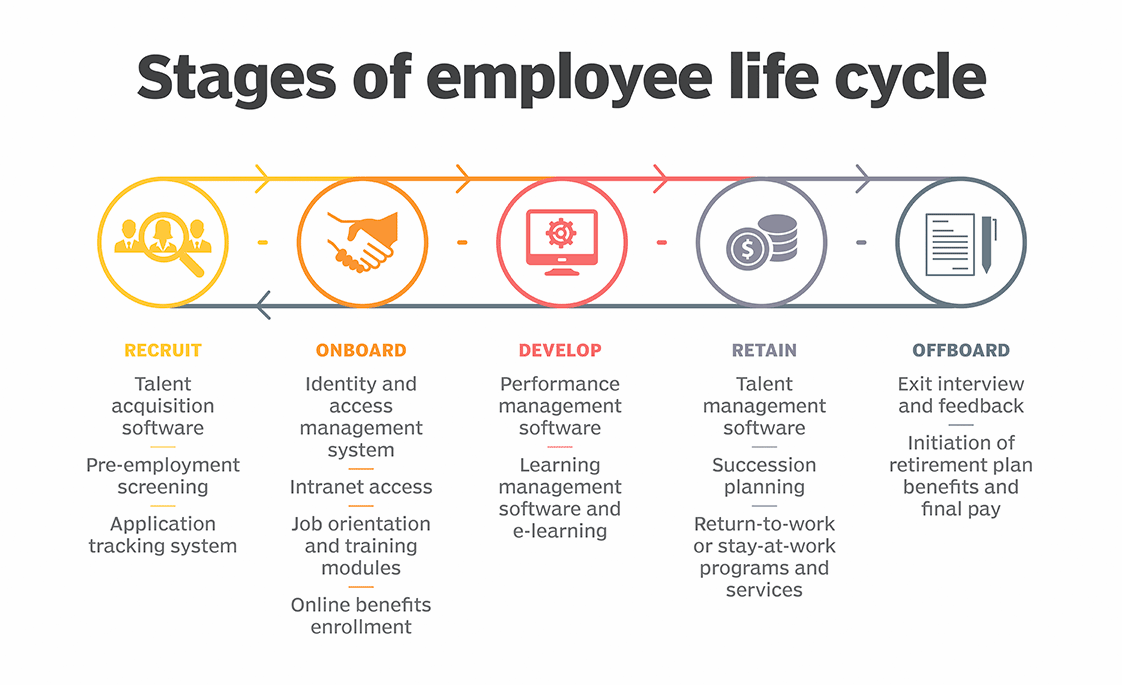 Жизненный цикл человеческих ресурсов — это путешествие, которое член команды проходит в течение своей работы. Также известный как жизненный цикл сотрудника, он начинается, когда сотрудник начинает свои отношения с компанией на этапе найма, и заканчивается, когда он покидает вашу компанию.