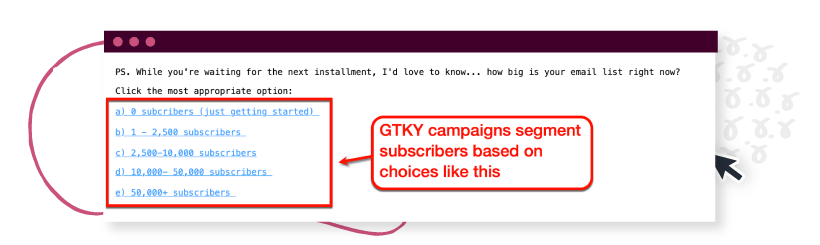 แคมเปญ GTKY เป็นสารตั้งต้นของแคมเปญอีเมลอื่นๆ ไม่คุ้นเคยกับการปิดการขาย พวกเขามี CTA ที่แบ่งกลุ่มผู้อ่านตามวิธีที่พวกเขาตอบคำถาม สิ่งนี้สร้างความไว้วางใจและเตรียมสมาชิกสำหรับการส่งเสริมการขายในอนาคต นี่คือตัวอย่างอีเมล #3 จาก Email Marketing Heroes ซึ่งเป็นแบรนด์ที่อยู่เบื้องหลังแคมเปญ GTKY: