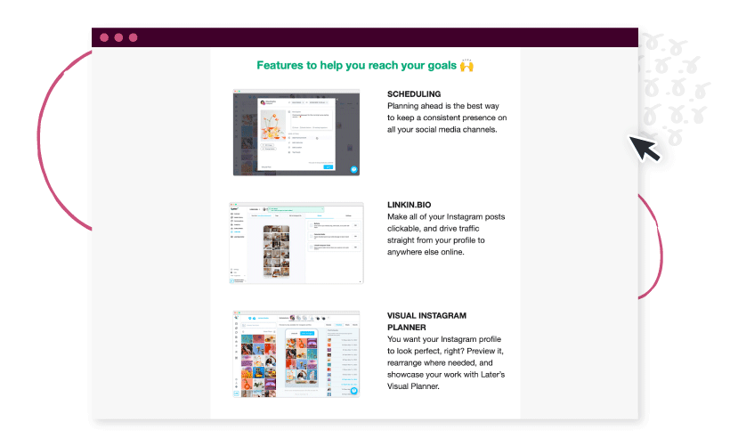 หลังจากทำตามเป้าหมายที่แล้วเสร็จ อีเมลเริ่มต้นต่อไปนี้จะกล่าวถึงคุณสมบัติขั้นสูงอื่นๆ เช่น การตั้งเวลา การใช้เครื่องมือวางแผน Instagram แบบภาพ การตั้งค่าลิงก์ชีวประวัติ ฯลฯ