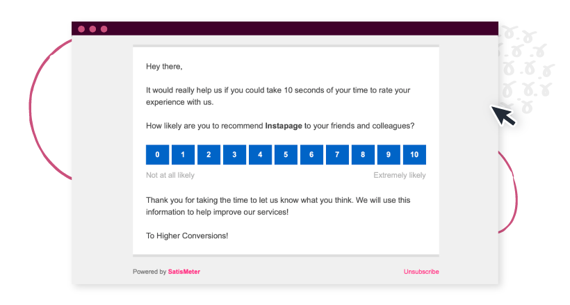 สิ่งเหล่านี้สามารถทับซ้อนกับแคมเปญการตลาดทางอีเมลอื่น ๆ ขึ้นอยู่กับเป้าหมายของคุณ ตัวอย่างหนึ่งคืออีเมลของ Instapage ที่ขอให้ผู้ใช้ให้คะแนนประสบการณ์ของตน