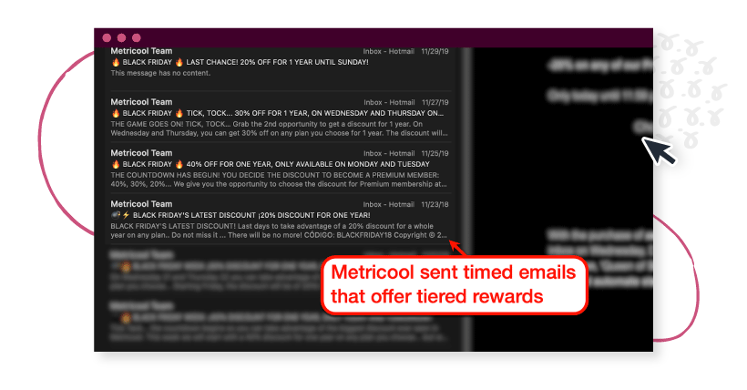 Metricool ทำงานได้อย่างยอดเยี่ยมด้วยแคมเปญ Black Friday หลังจากอีเมลที่นำไปสู่งาน Metricool ได้มอบส่วนลด 40% ให้กับผู้ที่ซื้อภายในสองวัน