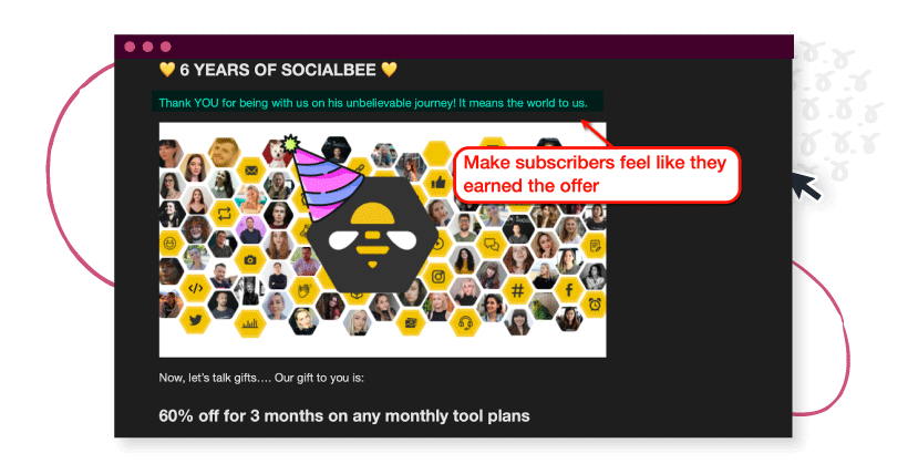 คุณยังสามารถส่งข้อความสั้นๆ "ขอบคุณ" ให้กับผู้ชมเมื่อบริษัทของคุณบรรลุเป้าหมายสำคัญ ตัวอย่างเช่น SocialBee ขอบคุณสมาชิกที่เป็นส่วนหนึ่งของการเดินทางก่อนที่จะพูดถึงส่วนลด 60%