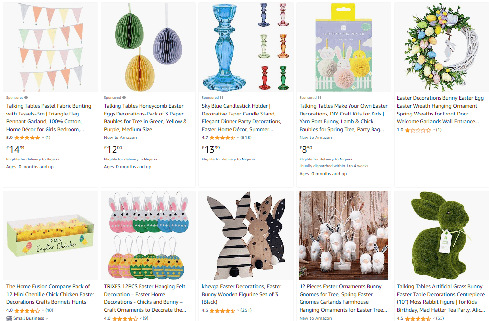 ทางเลือกอื่นสำหรับผลิตภัณฑ์ที่คุณสามารถขายในเทศกาลอีสเตอร์คืออุปกรณ์ตกแต่ง ทุกๆ ปี ผู้คนจำนวนมากจะตกแต่งบ้านของตนเพื่อเฉลิมฉลองวันหยุดแต่ละวัน สำหรับหลาย ๆ คน สิ่งเหล่านี้กลายเป็นประเพณีที่พวกเขาปฏิบัติตามอย่างเคร่งครัด ซึ่งหมายความว่ามีตลาดสำหรับอุปกรณ์เหล่านี้