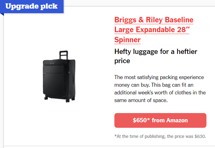 ลองนึกภาพว่าคุณคลิกที่บทความรีวิวกระเป๋าเดินทาง ที่ฝังอยู่ในบทความคือโฆษณา Amazon แบบกำหนดเองที่เชื่อมโยงกับกระเป๋าเดินทางสำหรับขายบนเว็บไซต์ของยักษ์ใหญ่แห่งการช้อปปิ้ง โฆษณาผลิตภัณฑ์เนทีฟนี้เป็นส่วนหนึ่งของหน้าเว็บที่ไร้รอยต่อ เข้ากับเนื้อหาที่คุณกำลังอ่าน มันยังแสดงเป็น 'ตัวเลือกการอัพเกรด' ซึ่งทำให้กระเป๋าเดินทางราคาแพงกว่านี้มีคุณภาพสูง และการอัพเกรดที่คู่ควรที่สุดที่ปรับราคาให้เหมาะสม