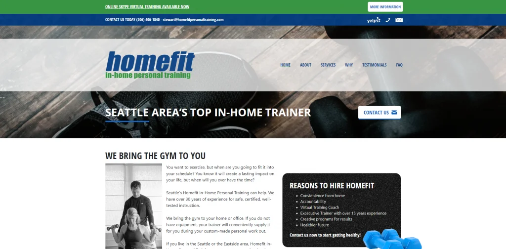 เว็บไซต์ผู้ฝึกสอนส่วนบุคคลนี้มีโทนสีเขียวและสีน้ำเงิน สีเข้ากันได้ดีและมองเห็นได้ทั่วทั้งเว็บไซต์ หน้าแรกมีข้อมูลไม่มากนัก ทำให้ง่ายด้วยข้อมูลเกี่ยวกับธุรกิจและเจ้าของ นอกจากนี้ยังมีลิงก์มากมายที่ด้านบนซึ่งให้ข้อมูลเพิ่มเติมเมื่อผู้คนต้องการเข้าถึงและค้นพบเพิ่มเติม ที่ด้านบนสุดของหน้าคือข้อมูลการติดต่อ และบางลิงก์สามารถดูคำวิจารณ์เพิ่มเติมจาก Yelp และโทรหรือส่งอีเมลได้อย่างรวดเร็ว
