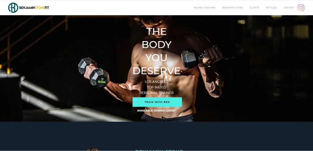 เว็บไซต์เทรนเนอร์ส่วนตัวนี้เรียบง่ายมาก มีรูปภาพขาวดำมากมายทั่วทั้งเว็บไซต์ ให้ความสำคัญกับข้อมูลที่เป็นลายลักษณ์อักษร สิ่งแรกที่นำเสนอคือรีวิวบางส่วนที่แสดงประสบการณ์ของผู้คนที่มีต่อธุรกิจ ในหน้าแรกของพวกเขา พวกเขาแบ่งปันข้อมูลสำคัญเกี่ยวกับธุรกิจและสิ่งที่พวกเขานำเสนอหากผู้อ่านเข้าร่วมทีม พวกเขาหวังว่าจะดึงดูดความสนใจของผู้ชมและนำพวกเขามาที่บริษัท ที่ด้านล่างของหน้าจะมีส่วน Instagram, Google map และข้อมูลติดต่อ