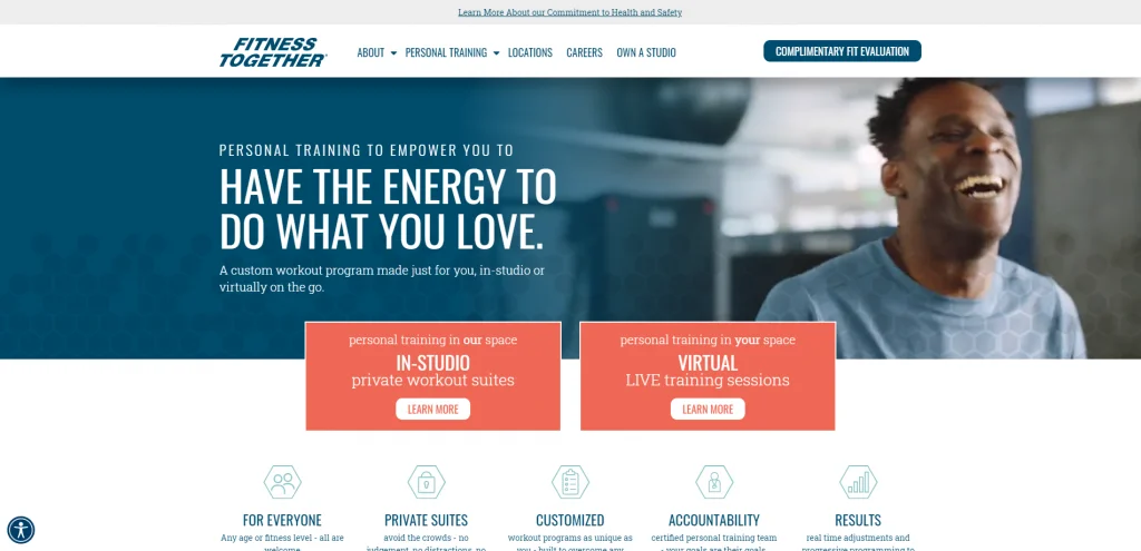 เว็บไซต์สำหรับ Fitness Together มีการออกแบบสุดเจ๋งพร้อมไอคอนและรูปภาพที่มีรูปร่างเป็นรูปหลายเหลี่ยม นอกจากนี้ยังมีชุดสีน้ำเงินและสีส้มที่ใช้งานได้ดีในเว็บไซต์ คุณลักษณะบางอย่างที่โดดเด่นในเว็บไซต์ผู้ฝึกสอนส่วนบุคคลนี้คือคำถามที่พบบ่อย บล็อกข้อมูล คำรับรอง และลิงก์สำหรับโซเชียลมีเดีย ลิงค์ทั้งหมดของพวกเขาจะปรากฏที่ด้านบนของหน้าพร้อมกับที่ด้านล่างทำให้ง่ายต่อการเรียกดูและค้นพบข้อมูลใหม่ สิ่งที่โดดเด่นอีกอย่างหนึ่งคือการเข้าถึงที่มีให้