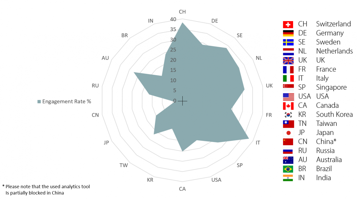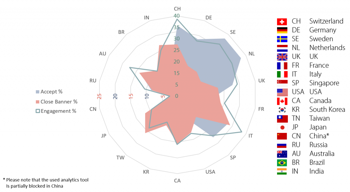 สวิตเซอร์แลนด์และประเทศในยุโรปส่วนใหญ่แสดงการโต้ตอบกับแบนเนอร์คุกกี้ที่สูงขึ้นอย่างมีนัยสำคัญ (อัตราการมีส่วนร่วม) ซึ่งอาจหมายความว่าผู้เข้าชมจากยุโรปมีความตระหนักในการปกป้องข้อมูลที่สูงกว่า หรือเพียงแค่แนวโน้มทั่วไปที่จะ "คลิกออกไป" และ "ปิด" เป็นผลมาจากแบนเนอร์คุกกี้ที่ใช้ตั้งแต่ปี 2545 ในที่นี้ สามารถสันนิษฐานได้ว่าผู้เยี่ยมชมเว็บไซต์ชาวสวิสก็มีเช่นกัน ทำความคุ้นเคยกับแบนเนอร์คุกกี้จากภูมิภาคยุโรป