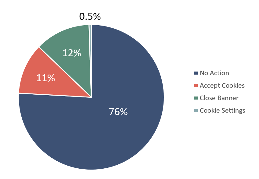 น่าแปลกที่ผู้เข้าชมร้อยละสูง (76%) เพิกเฉยต่อแบนเนอร์คุกกี้หรือไม่โต้ตอบเลย (ไม่แม้แต่จะปิดแบนเนอร์) แม้ว่าจะสามารถเห็นได้ในทุกหน้าและสามารถก่อกวนได้ ด้วยผู้เข้าชม 11% ที่ยอมรับคุกกี้ทั้งหมด การคาดการณ์ 3 ถึง 20% ดูเหมือนจะถูกต้อง ซึ่งหมายความว่าผู้เข้าชม 11% เหล่านี้อาจยังคงถูกใช้สำหรับ รีมาร์เก็ตติ้ง เนื่องจากคุกกี้การกำหนดเป้าหมายได้รับการยอมรับแล้ว