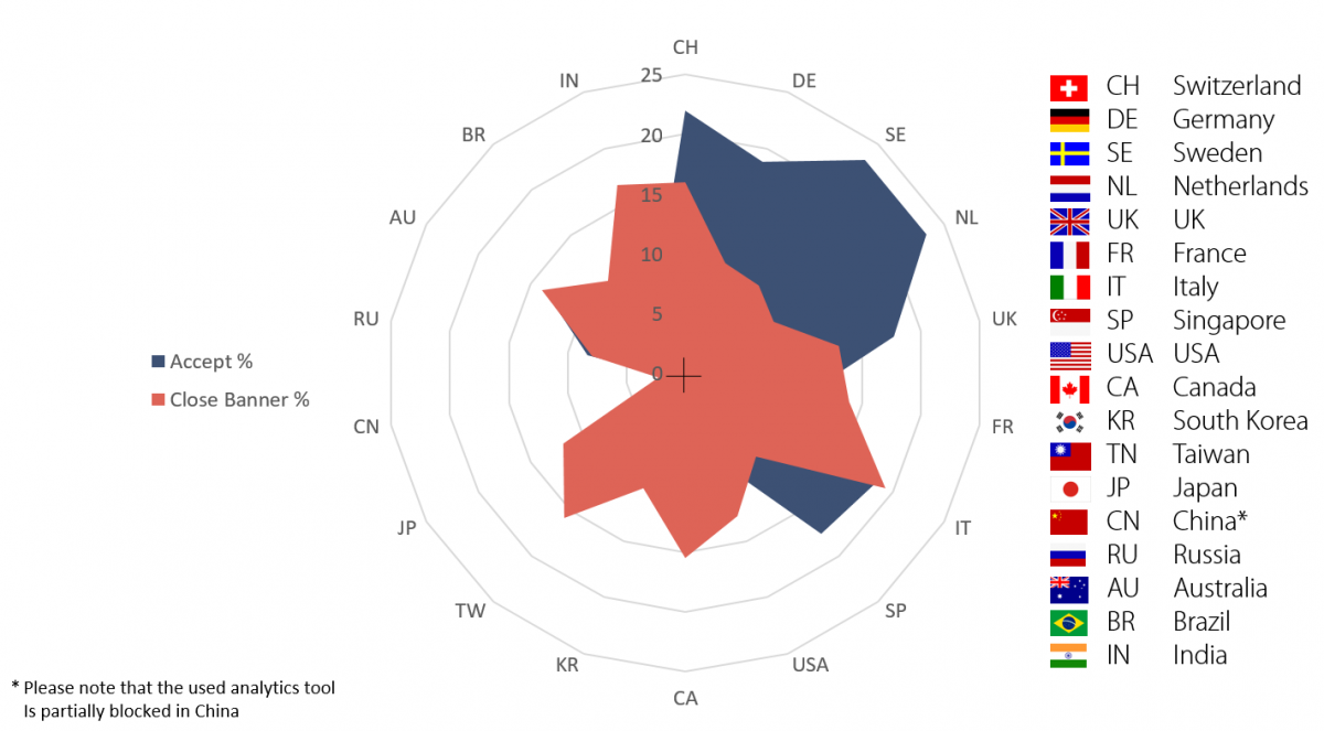 ความแตกต่างที่สำคัญระหว่างแต่ละประเทศนั้นน่าทึ่ง สวีเดน (23.3%) เนเธอร์แลนด์ (23.4%) และสวิตเซอร์แลนด์ (22.0%) มีอัตราการยอมรับคุกกี้สูงสุด ในทางตรงกันข้าม จีน (1.4%) ญี่ปุ่น (3.0%) และเกาหลีใต้ (4.3%) มีความเต็มใจที่จะยอมรับคุกกี้น้อยที่สุด