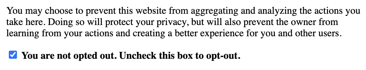 เพื่อปกป้องความเป็นส่วนตัวของผู้เยี่ยมชมของคุณ ด้วย Matomo มีตัวเลือกในการติดตั้ง Opt-out iframe บนเว็บไซต์ของคุณสำหรับผู้ใช้ที่ไม่ต้องการถูกติดตาม iframe นี้จะแสดงข้อความสั้น ๆ ให้ผู้ใช้ของคุณเลือกไม่ใช้ได้ด้วยคลิกเดียว คุณสามารถค้นหารหัสสำหรับ iframe ได้ในบัญชี Matomo ของคุณภายใต้การดูแลระบบ จากนั้นภายใต้ความเป็นส่วนตัว > การเลือกไม่ใช้ของผู้ใช้ iframe สามารถปรับแต่งได้ คุณสามารถเปลี่ยนสีฟอนต์ ตระกูลฟอนต์ ขนาดฟอนต์ และสีพื้นหลังได้ นี่คือตัวอย่างลักษณะของ iframe