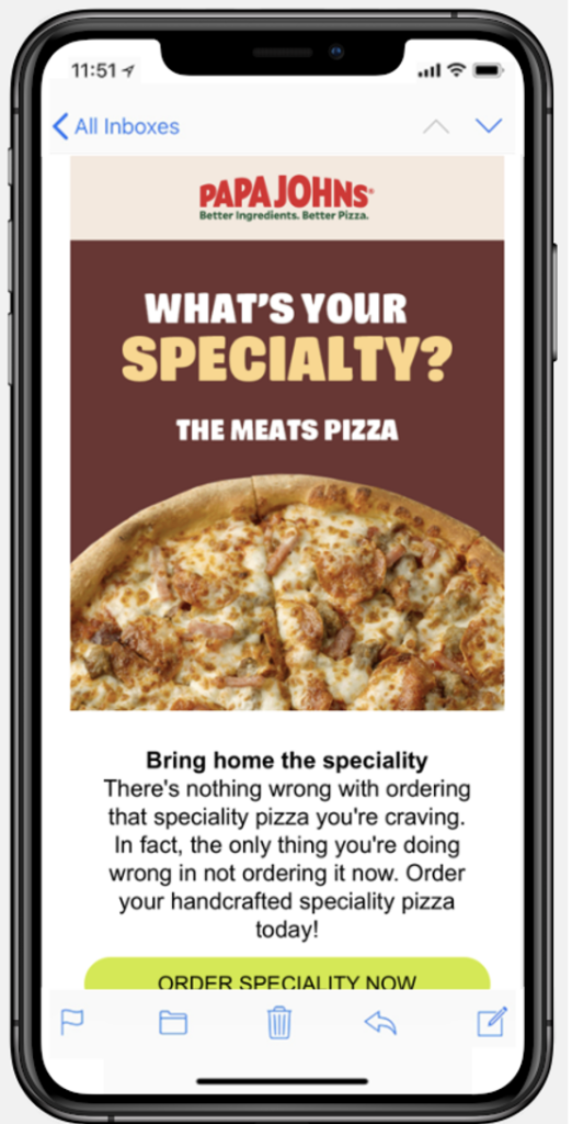 แม้ว่า SMS จะไม่สามารถดำเนินการได้จริงในปี 2023 แต่ต้องแน่ใจว่าคุณได้ปรับเนื้อหาของคุณให้เหมาะสมสำหรับผู้ใช้มือถือ เพื่อให้พวกเขาได้รับประสบการณ์ในเชิงบวก และพวกเขาสามารถเข้าใจข้อความของคุณโดยไม่ต้องยืดหน้าจอออก อีเมลของ Papa John นี้ทำอย่างนั้น