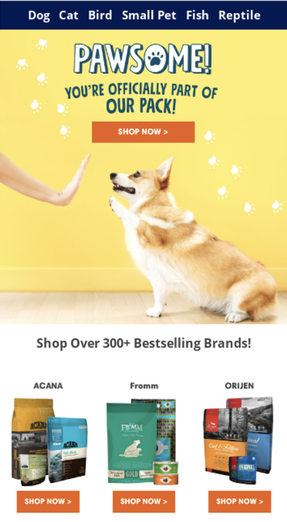 ตัวอย่างจาก Pet Flow นี้ยอดเยี่ยม—นำเสนอคอร์กี้ไฮไฟว์และเน้นตัวเลือกผลิตภัณฑ์ที่ยอดเยี่ยมตั้งแต่เริ่มต้นความสัมพันธ์