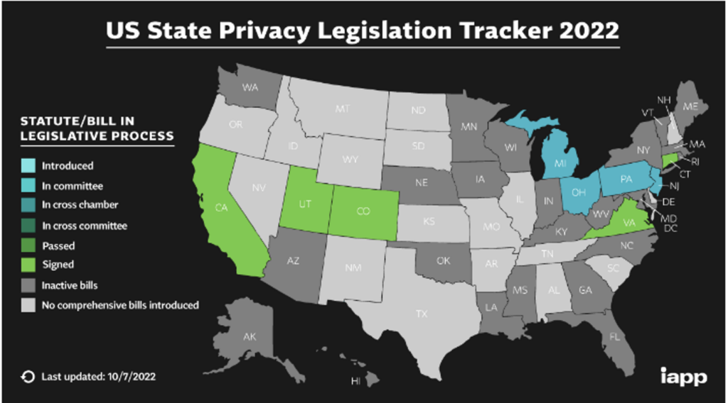 ในสหรัฐอเมริกา มีห้ารัฐที่กฎหมายความเป็นส่วนตัวของผู้บริโภคฉบับใหม่จะมีผลบังคับใช้ในปี 2023 ได้แก่ แคลิฟอร์เนีย เวอร์จิเนีย โคโลราโด ยูทาห์ และคอนเนตทิคัต