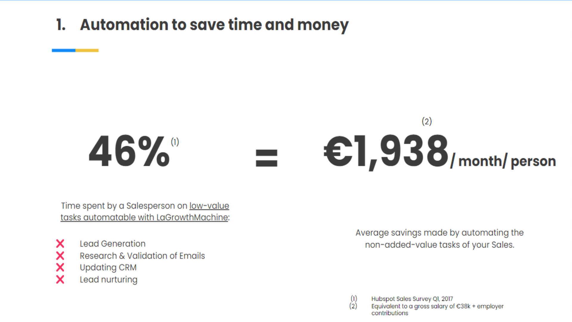 ไม่เพียงแค่นั้น แต่ด้วยความช่วยเหลือของเครื่องมือการขายอัตโนมัติที่เหมาะสม (เช่น LaGrowthMachine) คุณสามารถมอบประสบการณ์ที่ดียิ่งขึ้นให้กับลูกค้าได้ด้วยการทำให้งานธรรมดาบางอย่างเป็นแบบอัตโนมัติ และทำให้พนักงานขายของคุณมีเวลาว่างไปโฟกัสกับสิ่งที่สำคัญกว่า